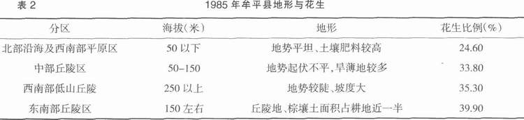 以即墨县为例,该县地处胶莱平原和胶东丘陵区的交接处,东部属于胶东丘陵区,岗岭起伏,而中西部则位于胶莱平原区,以平原地貌为主,间有少量丘陵。平度、泰安、胶州、莱西、滕州等县都有类似的地貌特征。需要指出的是,乐陵、茌平和沾化三县几乎没有低山丘陵地,但是其花生的种植规模也较大,推测与这些县存在较多沙质土壤有关。即使如此,相对于那些低山丘陵区较多的地方,这几个县的花生种植比例仍较小,而且没有形成大规模的集中产区。