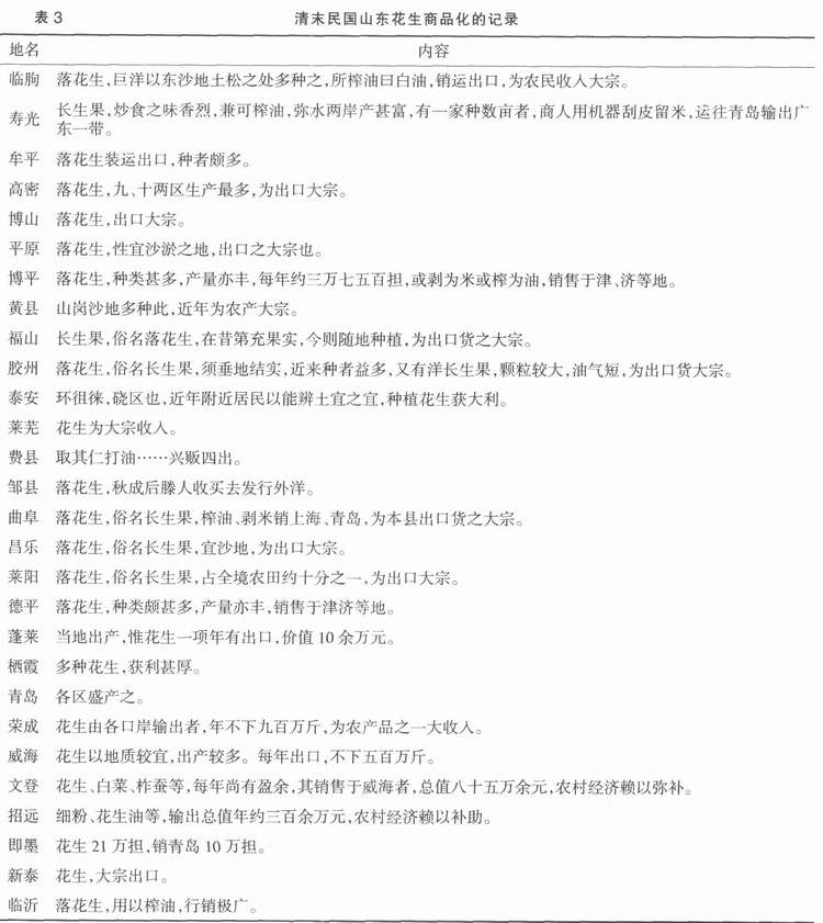 清末民国,随着气候转暖以及商业化的进一步刺激,花生成为低山丘陵区农民的主要经济作物,在胶东半岛、鲁东南和鲁中南地区形成集中产区。无论是一省之内,亦或者是一县之内,花生主要种植于那些低山丘陵较多的地方。近代通商口岸的开放将山东农民卷入国际市场,花生成为低山丘陵区农民与国际市场交往的媒介。在花生可以带来较高利润的情况下,这些地方的农民利用经济作物交换粮食作物的办法维持了农家的正常开支。