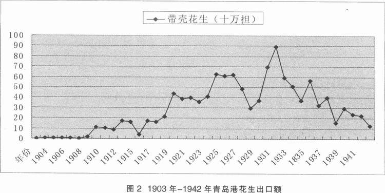 清末至民国年间,花生出口给各花生产区带来了高效益,成为农家收入的一个主要来源。青岛港是当时花生的主要输出港口,从其输出花生的数量上可以看到花生经济的繁荣。根据《近代山东沿海通商口岸贸易统计资料》中的青岛港历年花生输出额制成图2。