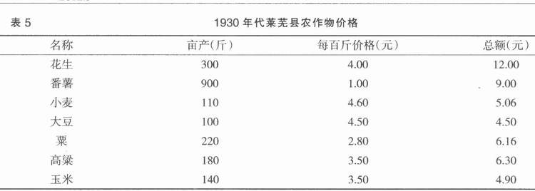 在粮食缺口如此大的情况下,低山丘陵区的农民并没有财力整修梯田。民国年间花生的种植给这些地区带来了繁荣,使得整修梯田成为可能。据上引《博山县志》和《莱芜县志》的材料,花生和番薯的产值要高于传统的禾谷类作物。《胶济铁路经济调查报告》提供了当时各种农产品的价格。将各种作物价格与产值制成表5。