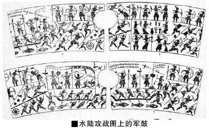 在古代,鼓也常用于军事指挥。《黄帝内传》云:“黄帝伐蚩尤,玄女为帝制夔牛鼓八十面,一震五百里,连震三千八百里。”在河南汲县山彪镇春秋时期的墓葬中出土的青铜鉴上,刻有水陆攻战的场景图,里面就有战鼓。在冷兵器时代,鼓与旗、金统称为“三官”,是战争中用于军事指挥的工具,用以报时、示警和振奋士气。《荀子•议兵》道:“闻鼓声而进,闻金声而退。”《左传•庄公十年》中曹刿曰:“夫战,勇气也。一鼓作气,再而衰,三而竭。”可见,在冷兵器时代,鼓在军事战争中的作用之大。