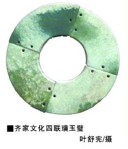 齐家文化在吸收西方金文化的同时,没有放弃东方玉文化传统。齐家文化玉器有30多种。武威皇娘娘台、广河齐家坪遗址出土的琮与良渚文化琮相似;皇娘娘台墓地48号墓随葬璧多达83件;2002年喇家遗址出土的一件三孔大玉刀,复原后长66厘米,是目前已知最大的玉刀,与二里头玉刀类似,可能是礼器中的“王者之器”;另外,还出土有三联玉璜、玉铲、玉斧等。