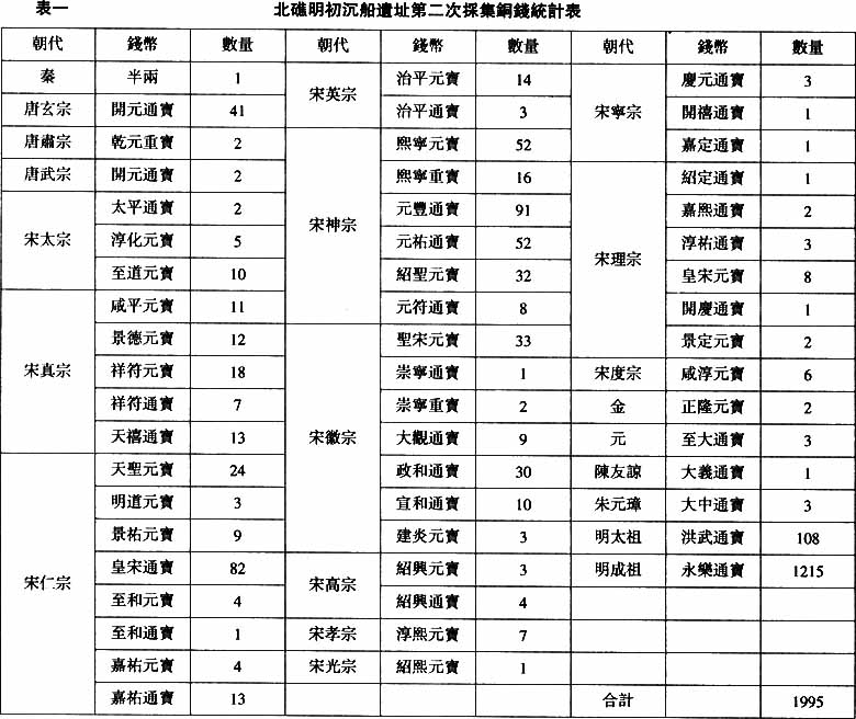 明代流通的錢幣,不少為舊錢,特別是唐宋錢,明錢只佔小部分。北礁沉船遺址出水從秦至明初多個朝代的各種錢幣,充分體現了這一點。這種情況不獨明代為然。2007年出水的宋代“南海Ⅰ號”沉船,從上世紀80年代始,先後出水多個朝代的錢幣6000多枚,有36種之多,年代最早的為東漢的“貨泉”,其次為隋唐時期的“五銖”錢和“開元通寶”;少部分為五代十國錢幣,如後周“周元通寶”、後唐“唐國通寶”;當然兩宋各朝年號銅錢最多。