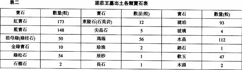 二是大量出土遗物來自海外。粗略計算,所有随葬品使用大量金銀珠寶,其中金16000克,銀13000克,玉14000克,各種寶石700多顆。世界五大名寶中,除鑽石外,其他名實在梁莊王墓都有發現(見表二),而且不乏精品。例如藍寶石中有藍色極優的品種,有金色的品種,有些大粒藍寶石重量近200克拉;金綠石多具貓眼效應,有些紅寶石、藍寶石具有星光效應。