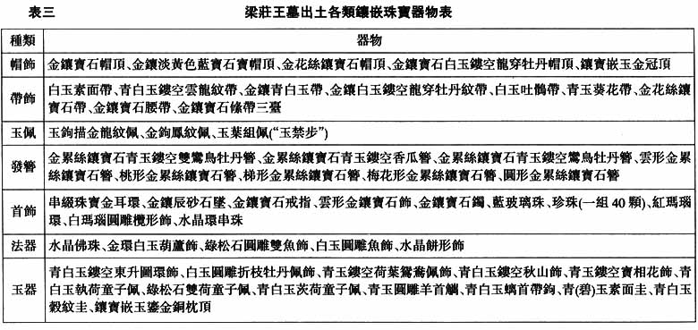 2005年9月30日至2006年1月2日,梁莊王墓出土文物精品在廣東省博物館展出,展品中鑲嵌各種珍寶的文物比比皆是(見表三)。當然,需要指出,這些寶物並不一定全部來自海外。