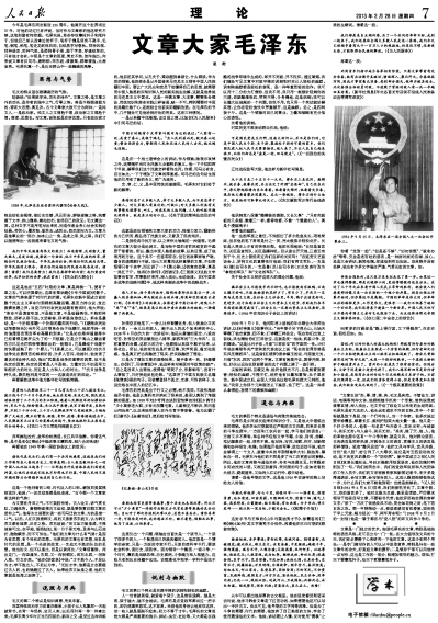 今年是毛泽东同志诞辰120周年。他离开这个世界将近37年,对他的功过已有评说,但对作为文章家的他还研究不够,这笔财富有待挖掘。毛泽东说,革命夺权靠枪杆子和笔杆子,但他自己却从没拿过枪杆子,笔杆子倒是须臾不离手,毛笔、钢笔、铅笔,笔走龙蛇惊风雨,白纸黑字写春秋。那种风格、那种语言、那种气派,是浸到骨子里,溢于字表、穿透纸背的,只有他才会有。中国是个文章的国度,青史不绝,佳作迭出。向来说文章有汉司马、唐韩柳、宋东坡、清康梁,群峰逶迤,比肩竞秀。毛泽东算一个,是历史群山中一座巍峨的高峰。