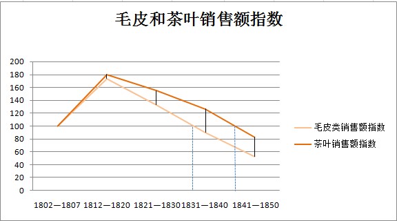 图2显示,毛皮和茶叶销售额指数变化的拐点均出现在1812-1820年间。换言之,在此之前两种商品销售额的增长幅度是递增的,此后便开始减小。销售额指数在100之前,虽亦呈递减趋势,但只是销售额增长的幅度在减小,其额度仍然是上升的。当销售额指数降为100时,意味着销售额也开始下降。毛皮类商品销售额指数在1831年左右降至100;茶叶是在1841年左右,即1841年之后其销售额逐渐减少,而茶叶的销售额指数在1812年左右出现拐点之后就持续下降。