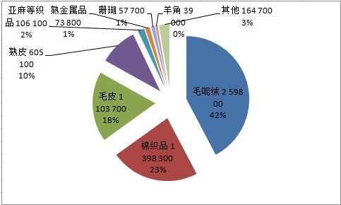 俄输出呢绒量除1937年外,每年都呈上升趋势,呢绒是以羊毛(或其他动物毛)为原料的纺织品,需要进一步加工而成的轻工业品,从30年代开始,呢绒输出量逐年增加。到19世纪中期恰克图市场中俄国输出货物分布情况已经发生了很大变化: