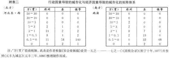 此外,将镇和县治的商税额进行的对比还显示了它们在公元l077年前经济地位和经济作用方面所发生的质变。大概在宋代一半以上的路中,县治的商税总额与商业活动的水平比其市镇,甚至更小的商业点要低。另有一些帝国的地区,在那里县治根本不交商税。这些县里的最大的税收额由其市镇或甚至由市场承担了。因为与其他商业点相比,我们倾向于更了解县治的税收额,所以我们有把握假定县治以下的商业区的商业活动水平和商业额比仅由公元l077年的数字所显示的要高。