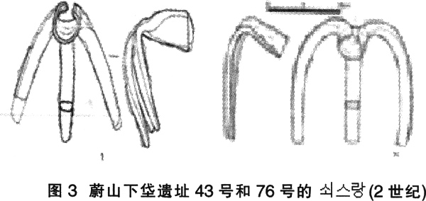 当然如图3的右侧,下垡遗址出现肩原形铁搭的形态。但是这与金海良洞里、浦项玉城里的铁搭类似,带有锐角(46~60度)。由此推断,它并非是专门入土用的农具,而是替代锄和镢,或起捞土堆肥的作用。[33]从2世纪出现的肩原形铁搭在以后持续使用的情况来看,铁搭的用途也根据此形态而适当地起了变化。