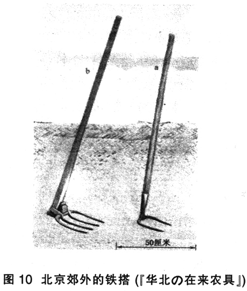 特别铁搭在粘土性较强的水田区域发挥更卓越的效果。首先人土时阻力较小把手部分向上或向前可以很容易的壤土,在水田碎土或者松土时,受到的抵抗力较小,从而使劳动效率变高。再加上铁搭的齿的长度很长。1956年扬州发掘的北宋初期的铁搭虽然仅仅全长17.8cm,[78]但从最近江苏省苏州周边区域使用的铁搭看它的齿长28~31cm(宽21~23cm的形态)有很大的增加。[79]从明清时代流传下来的铁搭看,我们值得关注当时的铁搭在水田深耕方面的制作。