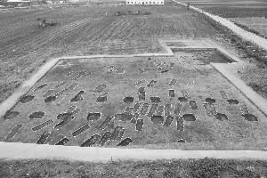 在环壕外,考古人员找到了两处墓地,共92座墓葬。这些墓葬都是长方形,竖穴土坑墓,成排成排地分布,有单人葬、双人合葬,还有多人合葬的。其中一个墓中,至少发现了6具遗骨,经专家检测,这些遗骨中其中三个死亡年龄大约是12~15岁。在考古现场,发现了碳化的稻谷,以及大量的陶片,这些陶片经过修复,变成了8000多年前的生活用品,有的是炊具,有的则是盛放粮食用的;还有的则是生活用的陶纺锤;另外,还发现了石质品,石斧、石锛、石磨盘、石磨球等。